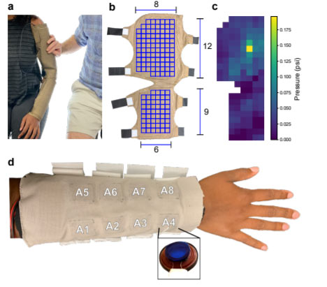 在近期发表在《IEEE Transactions on Haptics》学术期刊上的论文《Data-driven sparse skin stimulation can convey social touch information to humans》中,Okamura 的团队朝着这个目标又迈进了一步。在对几十名志愿者进行测试后,他们为「社交触觉,social haptics」设备开发了一个基本概念验证:一个内部缝有八个小型执行器的自制袖子。研究者通过以不同的模式操纵这些执行器,该团队能够为袖子的佩戴者提供他们通常可以识别为具有特定情感内容的感觉。