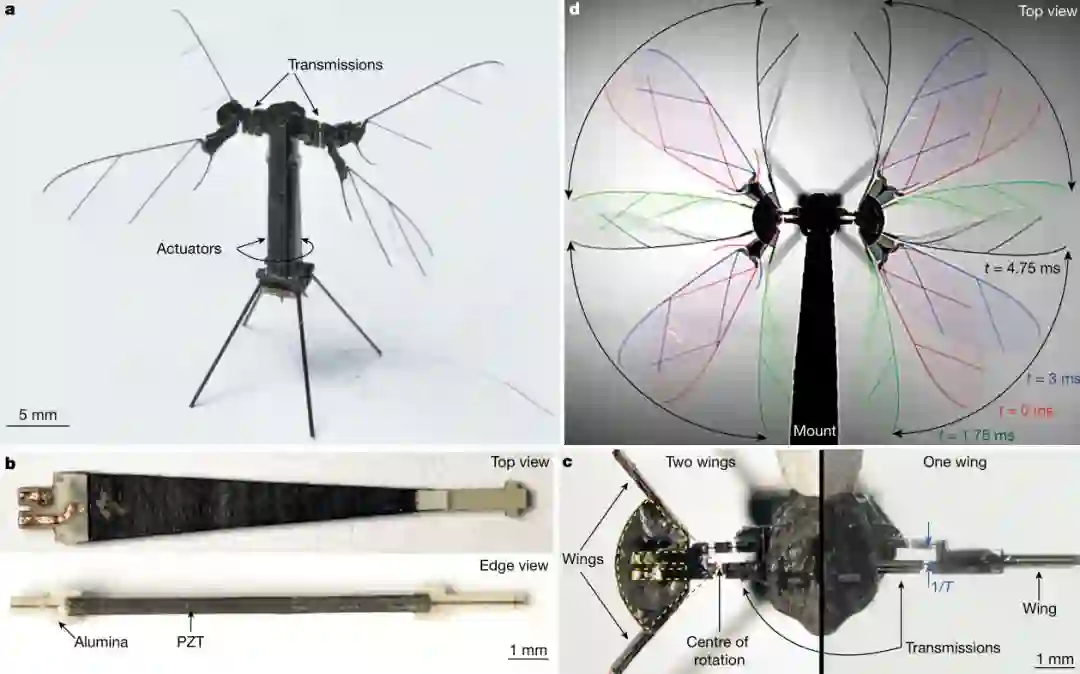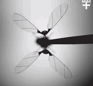 目前他们设计的扑翼系统采用了创新的四翼结构,前后摆动。这种运动是由集成压电材料(将电转化为机械力的材料)驱动,并产生足够的升力和可接受的功率需求。