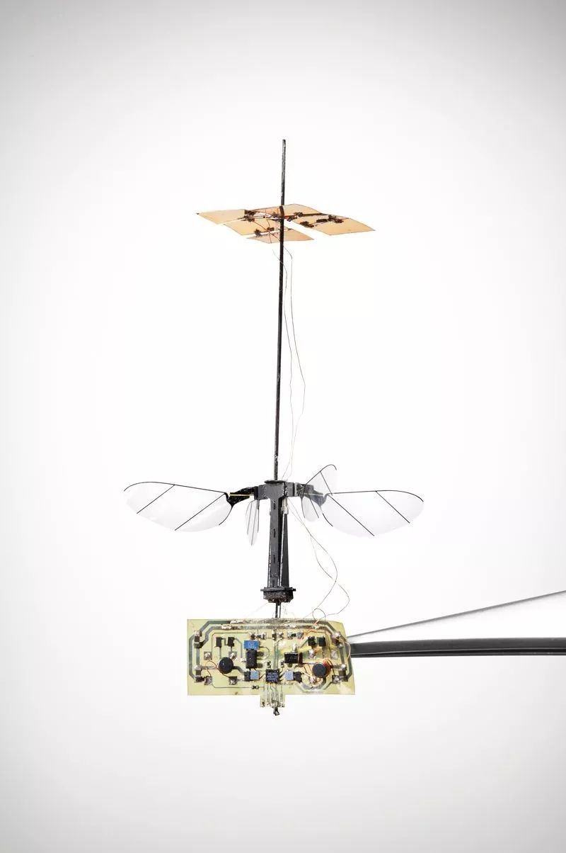 RoboBee X-Wing。只有几厘米大小的飞行器,通过扇动翅膀飞行。提供动力的太阳能电池板安装在机翼系统上方;电子设备则安装在机翼下方。
