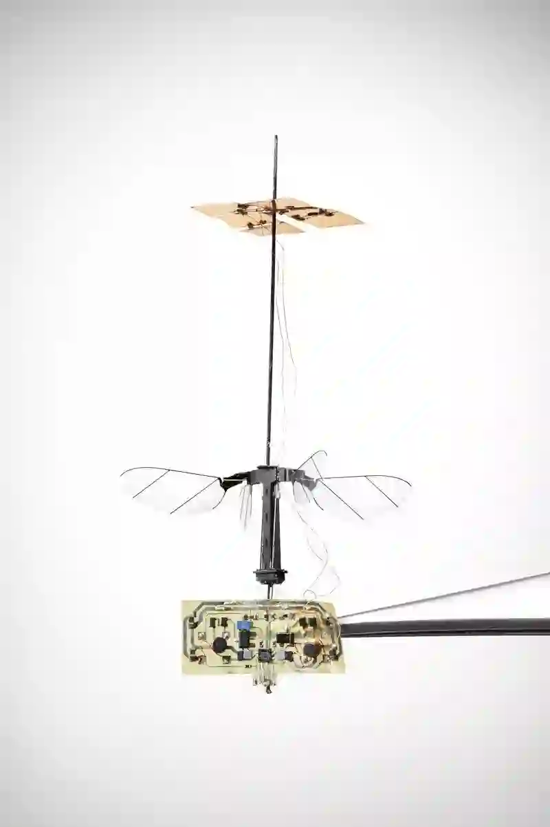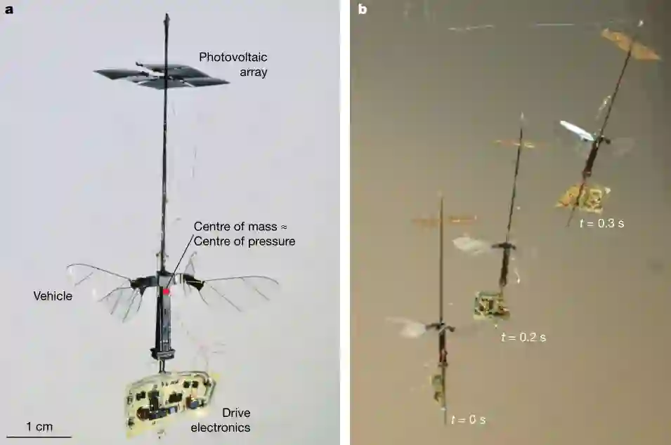 研究人员声称,这是迄今为止最轻的昆虫飞行器,它使用太阳能电池,只要有光源就能持续、不受束缚地飞行。