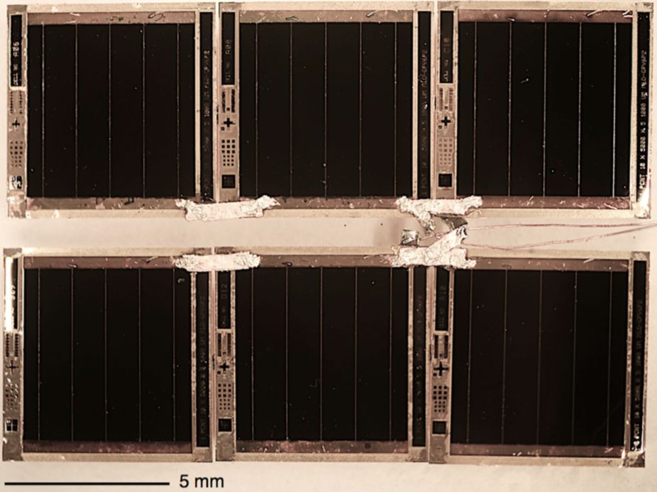 太阳能电池板,包含6块约5mm边长的太阳能电池