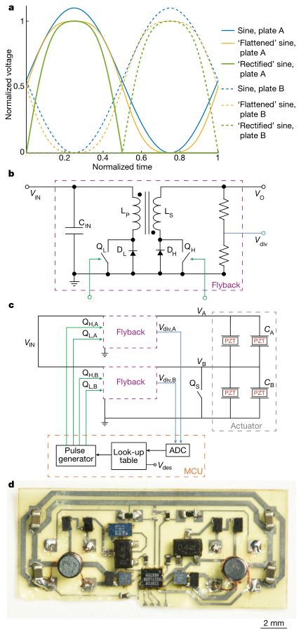 图3:驱动电子电路。a,三个驱动波形会产生相同的机翼运动。b,双向反激式转换器电路图。VIN是输入电压,CIN是输入电容,QL是低位开关,DL是低位二极管,LP为变压器初级绕组,LS是变压器次级绕组,QH是高位开关, DH是高位二极管,VO是输出电压。c,完整电路图,包括来自b(紫色)的两个双向反激转换器,驱动两个压电晶片(标记为“致动器”)。微控制器单元(MCU)中的一个模数转换器(ADC)(橙色)分别监视板A(V A)或板B(V B)的输出电压。由一个查找表将结果与期望电压V des进行比较,并对相应的开关产生脉冲信号。d,c图对应的真实部件。