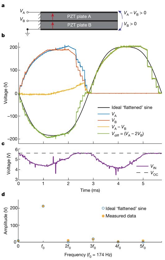 图4 | 驱动电信号示意图。a,致动器横截面图,表示了电压命名,极化方向(红色箭头)和弯曲方向(蓝色箭头)。b,对飞行器施加的实测电压。为了方便比较,我们绘制的是理想化的扁平正弦电压信号(Vpp = 193 V,f = 174 Hz,加入8.4 V的电压偏移以匹配数据。c,相应的输入电压(V IN); V OC是光伏电池阵列的开路电压。d,对实测数据(V diff)和理想化扁平正弦的前几个谐波的振幅比较。