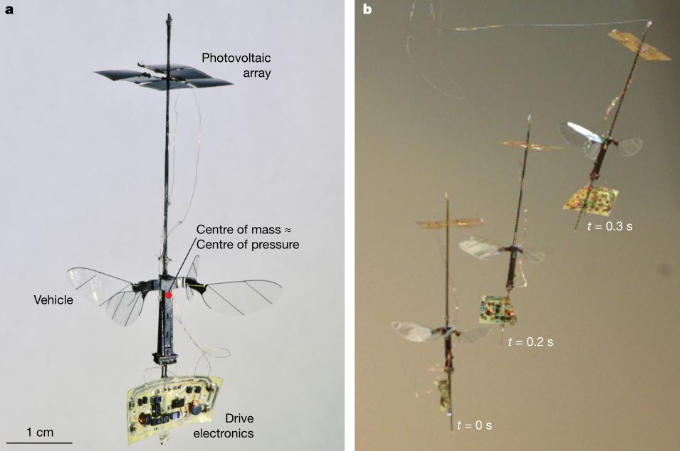 图1:RoboBee XWing飞行器及其性能。a,飞行器质量仅90毫克,有四个机翼,翼展3.5厘米。太阳能电池位于车辆上方3厘米处,以防止与机翼的空气动力学干扰。驱动电子装置定位使质心和压力中心对齐。整个集成系统重259毫克,高6.5厘米。b,飞行器在无附件飞行期间按设定拍摄视频。光源在机架外部正上方提供大约三倍于太阳的光强度。连接到太阳能电池阵列的Kevlar线的作用是确保飞行安全。