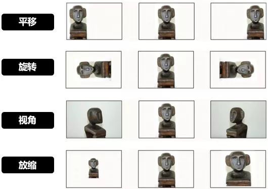从计算机视觉角度上讲,不变性指不随一些变换来识别一个物体,具体变换包括平移 (translation),旋转 (rotation),视角 (viewpoint),放缩 (scale) 等,如下图所示: