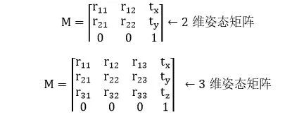 在 2 维平面中,我们加了 1 个维度 z,是为了方便完成平移操作。写出 2 维平面姿态矩阵 M 的一般形式,并延伸并类比到 3 维空间的姿态矩阵,表示如下: