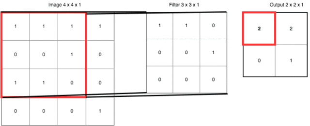 第一幅动图将一个 5x5 的图像馈送到 3x3 的滤波器。其步长为 2 (滤波器每2格滑动),没用填充 (最外层没有虚线格),结果产生一个2x2 的图像。