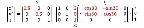 用 R, T, S 定义旋转、平移和缩放矩阵,那么将 (x, y) 先逆时针转 30 度,再向右平移 2 个单位,最后缩放 50% 到 (x', y') 可以由下列矩阵连乘得到