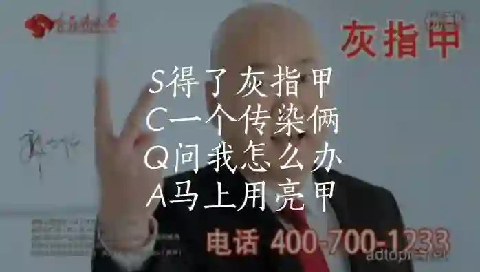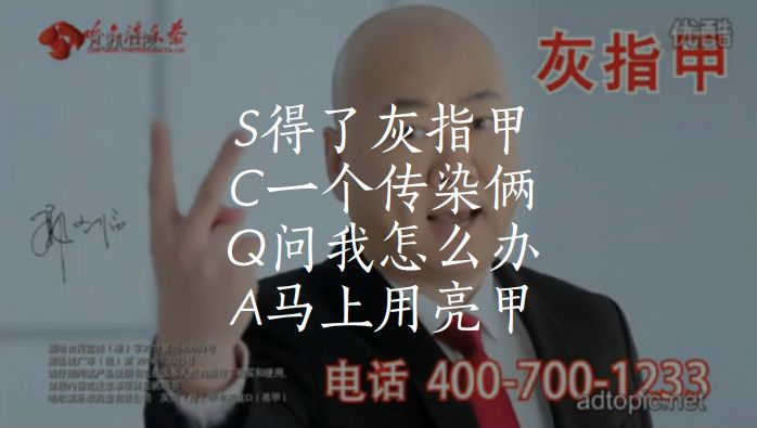 比如这个广告:(S)得了灰指甲,(C)一个传染俩,(Q)问我怎么办?(A)马上用亮甲。