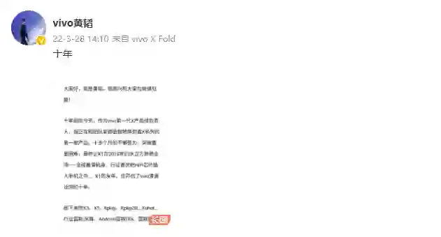 vivo 产品副总裁 @黄韬 随后发文为 vivo X Fold 预热,他表示,四年前 vivo 就已开始预研折叠屏,前前后后推敲过几十版方案但不断的自我否定。他认为折叠屏的“屏”是重中之重,不能因为折叠形态而牺牲屏幕体验,这是设计的初衷。
