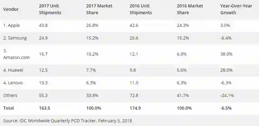 苹果在 2017 年总共销售了 4380 万部 iPad,IDC 估计三星和亚马逊年内分别出货 2490 万部和 1670 万部平板电脑。三星和亚马逊合计 4160 万台平板电脑,比 iPad 销售量低了 220 万台。