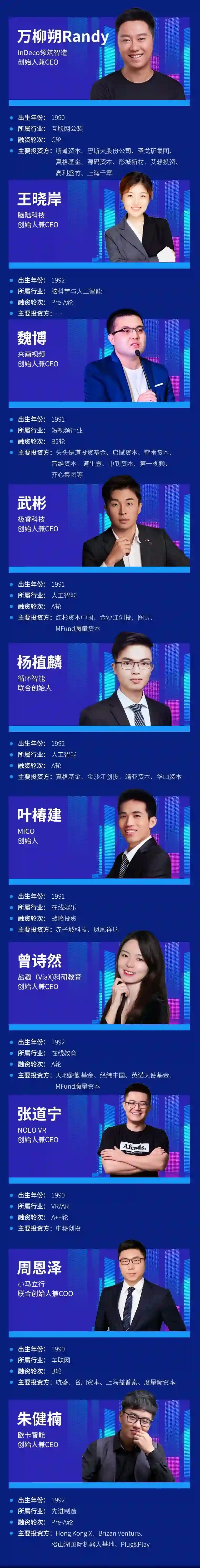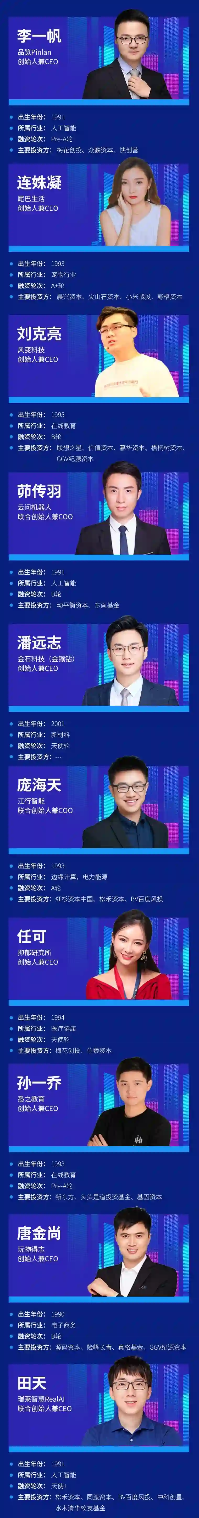 他们之中有年仅19岁的00后创业者,有11位连续创业者,超过50%聚焦在AI、先进制造、车联网等高科技行业,他们所创办的公司估值总额近130亿元,去年营收总额超过40亿元。他们运筹帷幄,将敏锐的商业洞察力和决策力发挥在人工智能、企业服务、教育培训、大消费、文娱等热门领域。