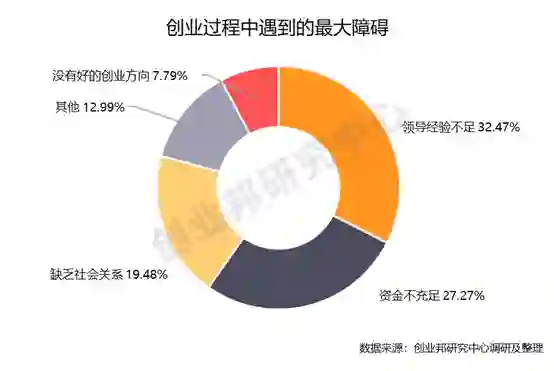 报名数据显示,32.47%的创业者认为自己创业过程中领导经验欠缺是最大的阻碍;其次,27.27%的创业者表示资金不足也是很重要的一点。