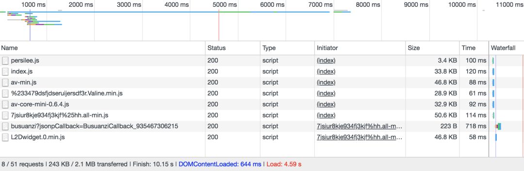 可见,请求时间是 4.59 s ,总请求个数 51 , 而 js 的请求个数是 8 , css 的请求个数是 3 (其实就 all.css 一个,其它 2 个是 Google浏览器加载的), 而没使用 压缩、合并 时候,请求时间是 10 多秒,总请求个数有 70 多个, js 的请求个数是 20 多个 ,对比请求时间 性能 提升 1倍 多。