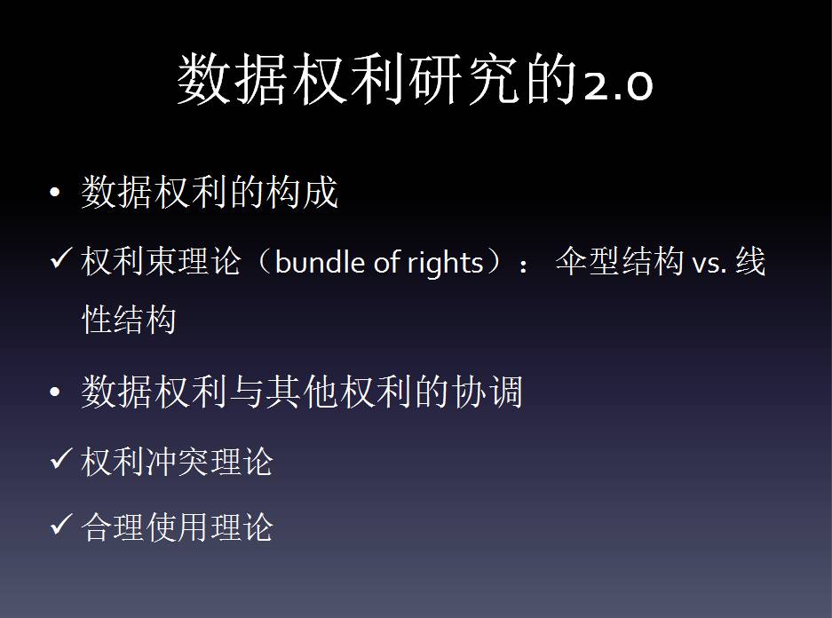 总之,数据权利研究究竟怎么一个2.0版,可能需要大家做更多努力的工作。一方面要进一步深入和细化,发现在特定场域下的特定规则,比如说流转的规则,转让的规则、披露的规则,同时考虑特定数据的规则,比如金融数据规则、健康数据的规则,一般消费数据的规则,或者纯粹商业数据的规则。另一方面,需要大家将这些规则加以系统化。我们不能依托于传统的形式规则,而是要用传统的形式规则提炼出来的那些理论原则,再去思考数据权利的问题。