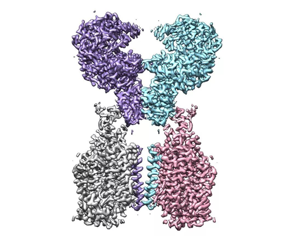 第一步,他们要获取ACE2蛋白全长蛋白,但作为膜蛋白的ACE2本身很难在体外稳定获得。研究人员在文献中发现ACE2与肠道内的一个氨基酸转运蛋白B0AT1能够形成复合物,根据过去研究氨基酸转运蛋白复合物的研究经验,他们判断,这个复合物极有可能稳定住ACE2。果然,他们通过共表达的方法获得了ACE2与B0AT1优质稳定的复合物,并利用西湖大学的冷冻电镜平台成功解析了其三维结构,如下图: