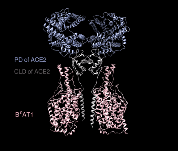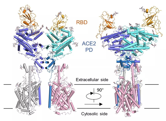 上面的蓝色和灰白色部分,是ACE2的两个结构PD(肽酶结构域,peptidasedomains)和CLD(Collectrin样域,Collectrin-like domain)。