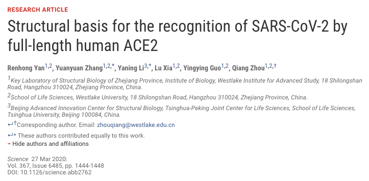 1.西湖大学周强团队,Structural basis for the recognition of the 2019-nCoV by human ACE2, Science, 27 Mar 2020,揭示新冠病毒和ACE2蛋白结合的结构: