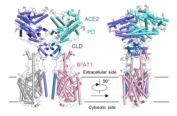 科学家们正在正在争先恐后地研究严重急性呼吸系统综合症“新冠病毒2(SARS-CoV-2)”的秘密,这是大流行性疾病COVID-19的起因。病毒进入的第一步是病毒的三聚体棘突蛋白与人类受体血管紧张素转化酶2(ACE2)的结合。Yan等人提出了人类ACE2的结构及氨基酸转运蛋白B0AT1的复合物。在这种情况下,ACE2是二聚体。进一步的结构显示了SARS-CoV-2的受体结合区如何与ACE2相互作用,表明两个三聚体棘突蛋白可能与ACE2二聚体结合。这些结构为开发针对这种关键相互作用的疗法提供了基础。