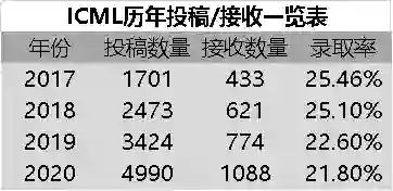 图注:从具体数据可以看到,ICML录取率已经是四连降了
