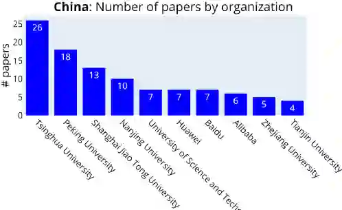 在中国,清华大学、北京大学、上海交通大学、南京大学名列前茅,百度和华为以及阿里巴巴数量都超过了五篇。