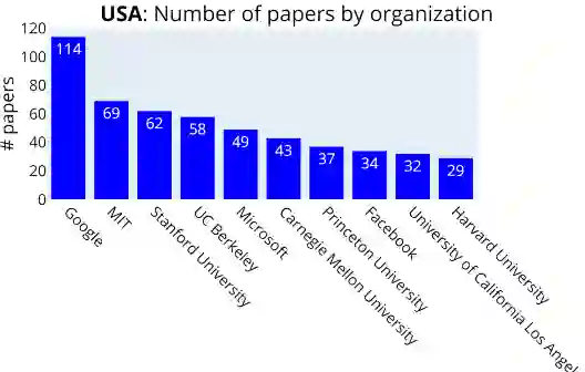 机构层面如何呢?如上图所示,谷歌占据了榜首,麻省理工排名第二,斯坦福大学位列第三,数量分别是:114篇、69篇、62篇。值得一提的是,由于部分论文是合作完成的,因此Google的114篇和Deepmind的51篇中有部分重合。