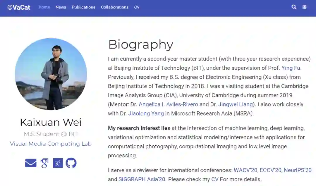 从作者的个人主页我们得知,此同学目前是研二学生,师承北京理工大学计算机学院可视媒体计算实验室的付莹教授。其于2018年在北京理工大学获得电子工程学士学位,在2019年夏季成为剑桥图像分析小组的访问学者,当时的导师是梁经纬和Angelica I. Aviles-Rivero。此外,他还与微软亚洲研究院的杨蛟龙有密切合作。