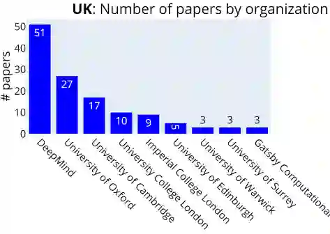 在英国,Deepmind的数论数量一骑绝尘,大学研究院分别跟随。