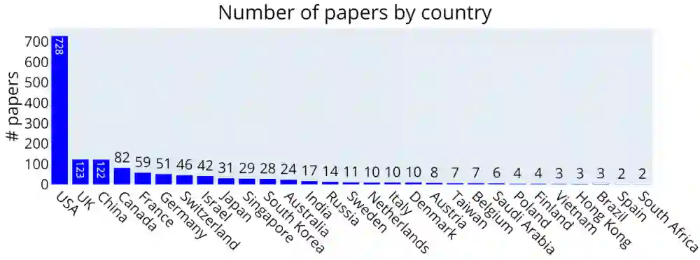 作者在博客中也对统计规则进行了说明:国家或地区是根据组织机构的总部所在地而定,而非论文作者所在位置。因此,如果一位论文作者在 Google 苏黎世工作,那么该论文被计入美国,而不是瑞士。