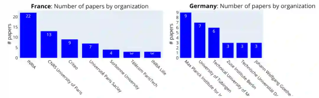 综上,似乎除了美国和中国以外,大多数排名靠前的组织都是大学。在全球范围内,大学发表的论文数量是公司的3倍。
