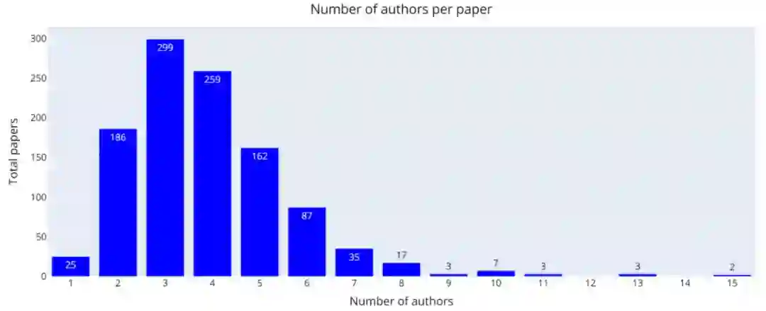 论文协作是什么情况呢?大多数论文有 3-4 个作者,但是也有一些例外情况,比如 15 个作者。