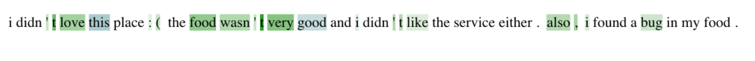 以LIME[5]模型举例,输入扰动可以通过生成输入x的随机扰动并训练一个可解释的模型(通常是一个线性模型)来解释输入x的输出。LIME 的主要思想是,通过训练一个模拟原模型但更简单的模型来解释原模型是如何做出预测的。因此,可以利用更简单的模型(也称为替代模型)来解释原始模型的预测。此方法不涉及模型内部,而是通过对输入进行大量且轻微的扰动(例如删除不同的单词),观察黑盒模型的输出所发生的变化,然后根据这些输入输出训练简单且可解释的模型。由于替代模型是一个简单的线性分类器,通过给每个单词分配一个权重来进行预测,因此我们可以看到分配给每个单词的权重来了解每个单词如何影响最终预测。最终得到的效果如下图所示: