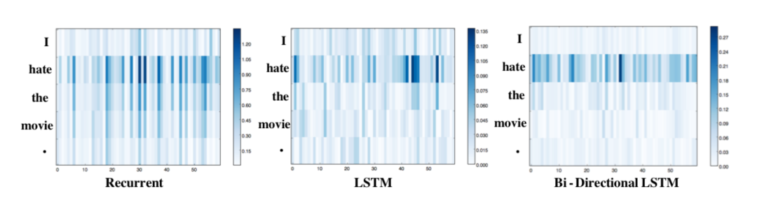 这三种模型中"hate"都具最高的显著性分数,并削弱了其他token的影响。LSTM比标准的循环模型更清晰地关注"hate",双向LSTM的效果最为明显,除了"hate"之外的单词,其他单词几乎没有影响。这可能是由于LSTMs和Bi-LSTMs中的门结构机制控制了信息流,使得这些架构能够更好地过滤掉不太相关的信息。此外一阶导数显著性常用于神经网络模型,因为可以通过单独调用深度学习引擎提供的自动求导来计算得到。最近的工作还提出了对一阶导数显著性的改进[21]。如其名称和定义所述,一阶导数显著性可以实现特征重要性的可解释,特别是在token-level的特征。