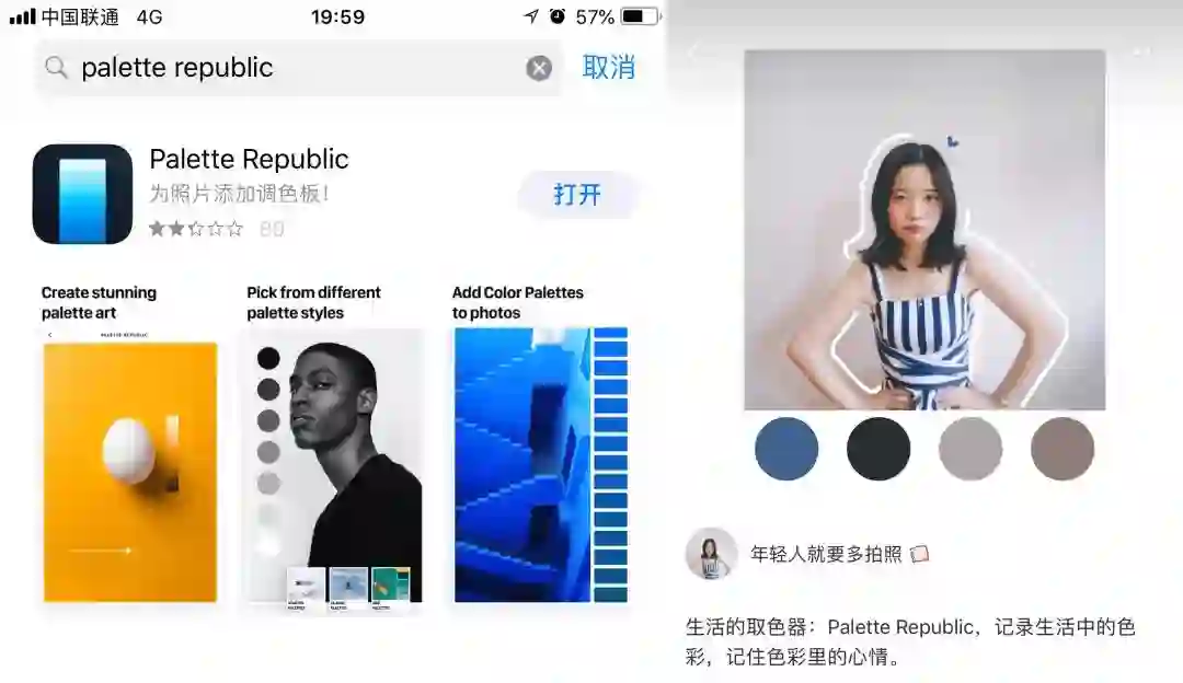 以Palette Republic为例:官方介绍语是“为照片添加调色板”,但我们可以给它赋予更多有温度的意义,我写的是“生活的取色器,记录生活中的色彩,记住色彩里的心情”。