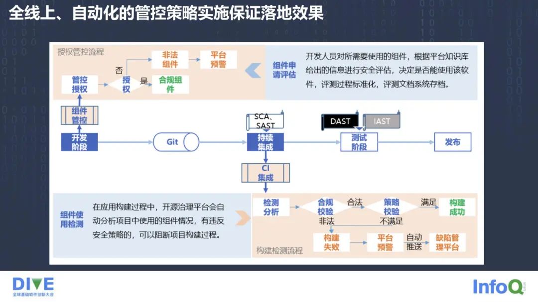 微众一直在致力于建设贯穿 DevOps 开发流程的开源治理方案。在整个阶段有开源框架和组件选型的评估,同时有整个公司的开源软件的黑白名单管理;在开发阶段开发了 IDE 插件工具,能够非常方便地自主扫描所开发系统的组件依赖关系,并且可以根据治理策略及时给开发同学各种提醒和帮助,使开发侧能够更及时处理修复问题。在构建测试阶段会做自动触发的依赖扫描,根据设定的规则自动执行各种策略。在生产部署环节有针对性的安全漏洞审查,以及生产部署策略的自动执行。