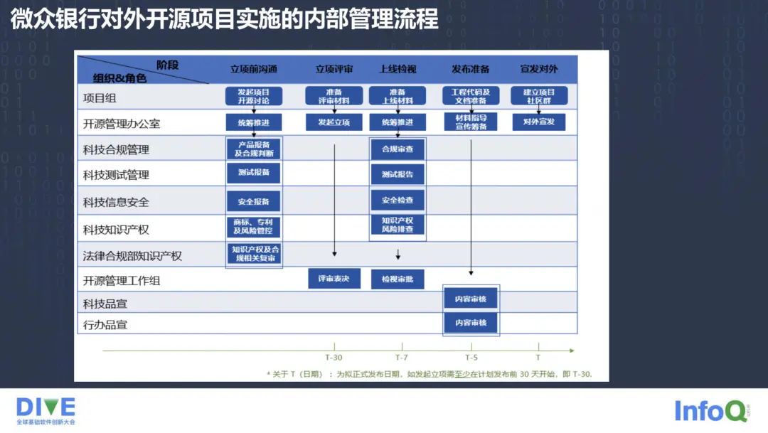 开源项目的质量如何保障?微众银行对外开源的流程大致划分了几个阶段。规划阶段主要希望明确项目目标,同时客观对市场上已有的类似开源项目做比较,同时审慎盘点能够投入开源的资源力量,避免后期资源投入不足造成后期无力的情况。在实施阶段要注重开发质量,给开源项目的名称、商标、知识产权保护等都需要做提前规划。开源前还需要做全方位审查,一方面要符合开源项目的基本规则,遵守所选择使用的许可证约束,另外也需要确保公司的核心定义和相关资产能够受到保护。最后一个阶段是正式开源阶段,要选择合规的代码托管平台做好代码管理,并进入正式的社区运营阶段。一个项目刚开始亮相的时候也需要做好宣传推广的工作,促进后期更好的发展。