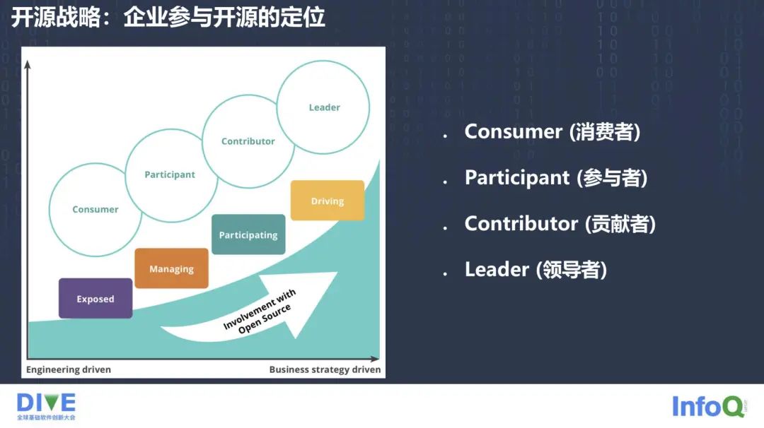 根据 Linux 基金会的模型,企业引入开源的模式可以定义为阶梯型的策略。在消费者阶段,企业主要关注如何用好开源软件;参与者阶段,企业会参与社区活动,更深入了解所使用的开源软件;贡献者阶段,企业可能参与上游贡献、自己发起开源项目等;领导者阶段,企业会在社区发挥重要的领导作用,影响相关技术或组织的发展,并成为某些开放标准的制订者。