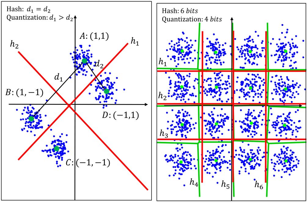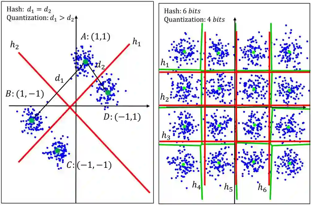 图1: 哈希和量化对比的二维案例。左:量化的距离更加丰富;右:量化需要的比特数目少。