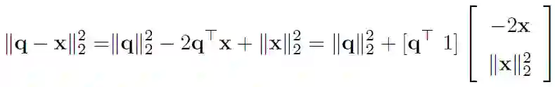 这里面,集合元素x和查询目标q可以是向量、集合或者其它形式,dist(.,.)是相应的距离。在文本相关的应用里,距离的定义基于Jaccard相似度:sim(A,B)=(A∩B)/(A∪B);在计算机视觉、多媒体、机器学习及计算几何等领域里,研究及使用最为广泛的是欧氏距离度量:dist(x,q)=\|x-q\|_2,这一类问题是本文关注的重点。除此以外,基于内积相似度sim(x,q)=q^⊤ v的最近邻搜索也有不少研究。
