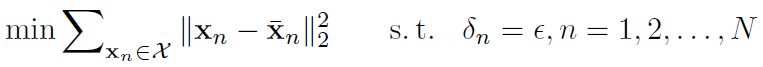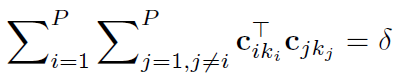 也可以通过查表的方法做,但是计算复杂度依然很大,所以近正交合成量化在优化字典的时候引进一限制条件,让这一项变成常数ε,从而这一项可以不用计算了。所以近正交的合成量化的优化目标是最小化量化误差,同时加入常数项限制: