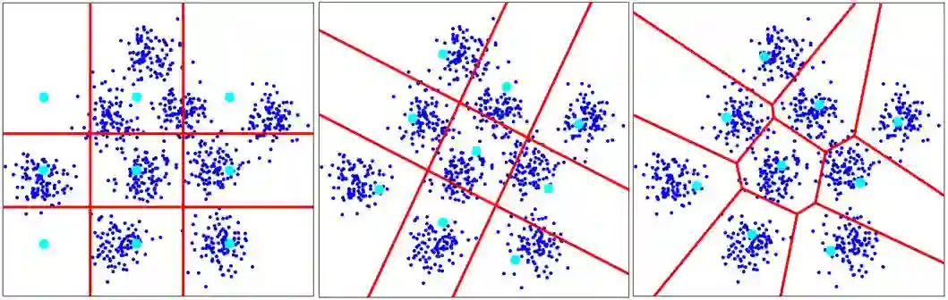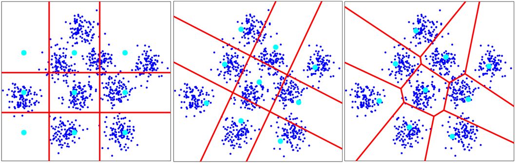 图2: 比较乘积量化、优化的乘积量化以及合成量化的二维案例。左:乘积量化;中:优化的乘积量化;右:合成量化。