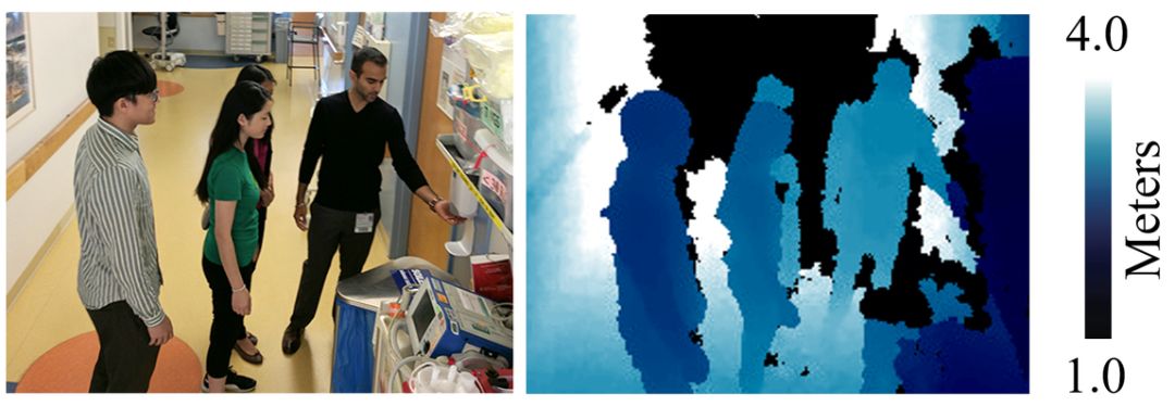 (左)用手机相机拍摄的医院彩色照片。(右)天花板上的传感器拍摄的对应深度图像。颜色越深表示物体距离深度传感器越近。