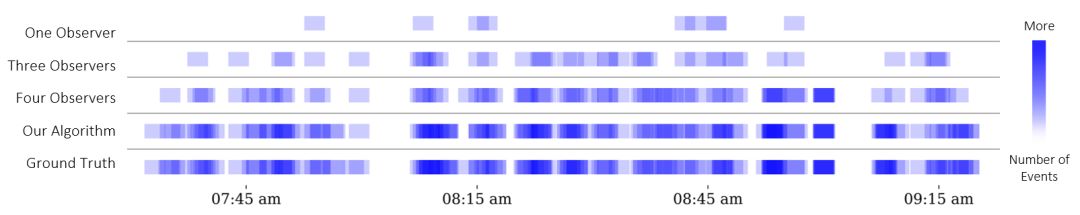 观察员效果比这好得多,准确率为 63%,而三个人做得更好,72%。但是,我们的算法甚至超过了人类观察员,达到了 75% 的准确率。这个结果在意料之中,毕竟观察员的对手是具有「全局视野」的计算机视觉系统。不过,既然真实标签是由人类标注的,人类观察员怎么会比算法做得还差呢?这是因为真实标签是被远程标注而非实时标注的。远程标注者可以访问所有的传感器,并及时向前或向后播放视频以确保其标注是准确的。而在现场的观察员不能「访问」所有传感器,也无法及时回放事件来确定自己的观察是否准确。
