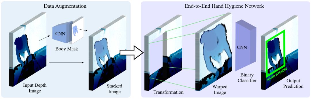 (左)带有人物分割的数据增强阶段。(右)手部卫生活动分类器:空间变换网络加上密集连接卷积网络。