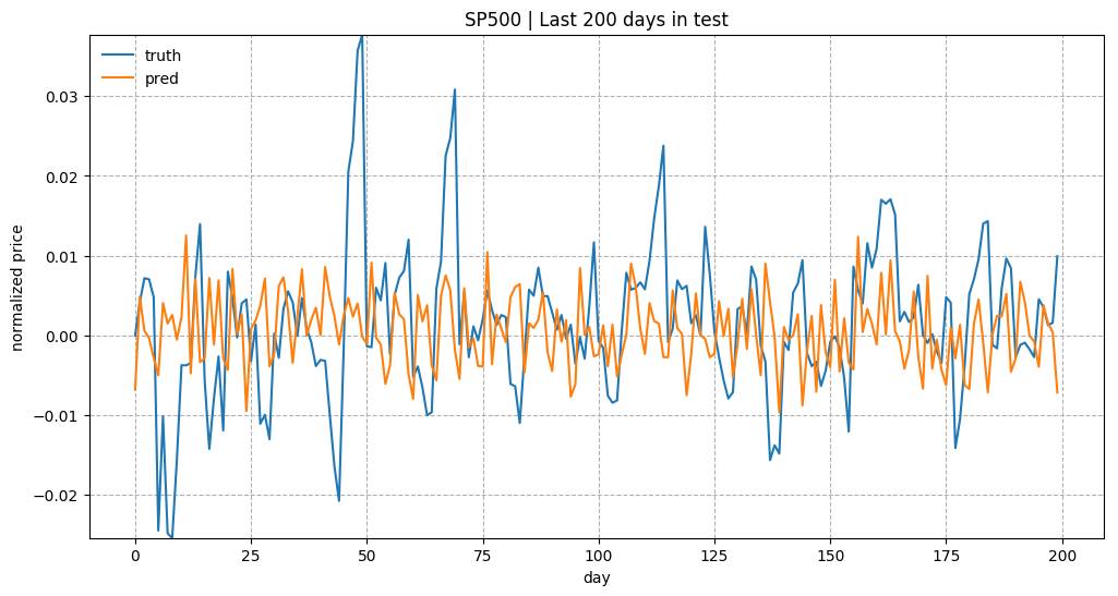 测试数据中最近200天的预测结果。 模型是用 input_size= 5 和 lstm_size= 128 来训练的。