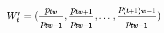 为了解决样本外的问题,我们在每个移动窗口中对价格进行了标准化。 任务变成预测相对变化率而不是绝对值。 在t时刻的标准化滑动窗口W't中,所有的值除以最后一个未知价格 Wt-1中的最后一个价格: