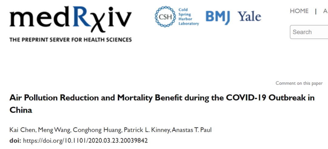 近日,耶鲁大学公共卫生学院 陈凯 博士、绿色化学之父 Paul T. Anastas 教授等在医学预印本 medRxiv 发表题为:Air Pollution Reduction and Mortality Benefit during the COVID-19 Outbreak in China 的论文。