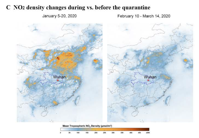卫星拍摄图片也显示隔离期间全国的空气中二氧化氮(NO2)浓度急剧下降。