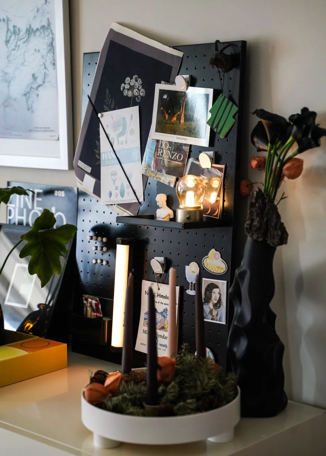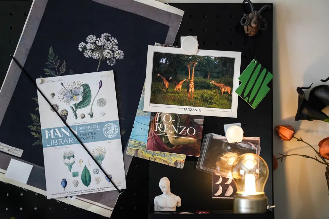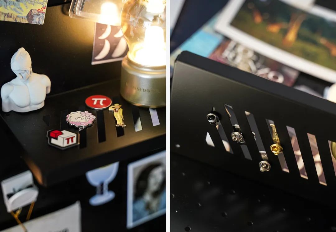 前段时间为了改造自己卧室的电竞区域,参考了许多网上的桌面搭配,「洞洞板」的出镜率竟意外的高。扩展性与收纳潜力的强大,除了电竞氛围,也很适合用在露营装备收纳与艺术装饰之中,于是决定也购置一块放在家里。最初其实是在线下的宜家买的斯考迪斯洞洞板,36cm x 56cm 的米白色版本,也采购了配套的弹力绳和一些挂钩。到家搭建起来总觉得和想象中有些许落差,尺寸有些小,和工作台风格也不算适配,整体来说还是太过「居家」,于是就收纳起来挪作他用。也终于意识到自己可能还是需要一块更大、质感更「硬」的板子,在某书上又做了一些检索和寻觅,最后选了 oroliving 的黑色金属洞洞板,50.5cm x 71.5cm,尺寸终于是对了。但另一个尴尬点随之而来,原先计划在卧室打孔上墙放置,结果自己买的钻孔机似乎功率不太够,钻不了太深,而且铁质板材的重量比想象中更沉,担心损坏墙面,最终还是决定立在桌面,靠墙使用。开始装饰时才发现自己没有足够多的数码器材,完全填不满,还是暂且做成装饰性洞洞板,用来收纳自己收集的纸质材料。包括冰箱贴,美术馆导览手册,迷你装饰画和朋友寄来的明信片等等。宜家配件的规格与洞眼和这款并不适配,虽然他们店内也出售各种颜值相当高的配件,但我为了节约成本还是决定自己寻觅「平替」款。铁质洞洞板最大的优势就是兼容磁吸材料,所以通过检索比如「冰箱置物架」、「磁吸笔筒」、「磁吸夹」之类的关键词我找到了不少物美价廉的配件,带有功能性的冰箱贴也完全可以使用。另外我的摄影用 LED 灯棒也自带磁吸套,索性也固定在了洞洞板上,可以通过 APP 调整光强和色温,远距离看挺像以前的古早电气灯。在此之前我的徽章和胸针都是单独收纳在一个小盒子里,正准备一个个通过洞洞板洞眼固定并且把旋扣固定在板后时,意外发现买的平替置物架底部的长条形镂空槽正好可以收纳,这样就不用每次取胸针都需要转动板材(因为真的挺沉的),属于意外之喜。实不相瞒,最初对洞洞板的幻想还是网络上那些固定有发光灯板、游戏手柄和各种磁吸数码配件的 Tech Wall 氛围担当,但现在的艺术板也不错,等之后数码器材多了再作迁移也不迟。