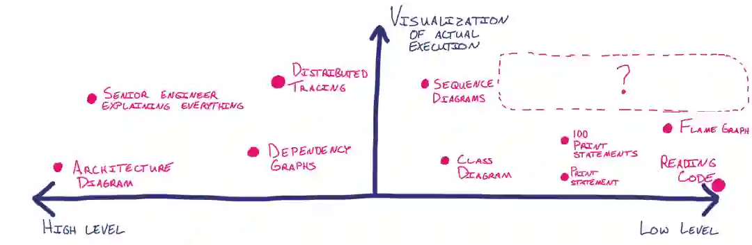 让我们想一下,可视化如何很好地表示整个系统实际的代码执行情况呢?在这种情况下,高级的架构图得分也许不会很高,因为它抽象掉了服务框内的许多细节。分布式跟踪可以做得更好,不过具体程度取决于有多少个跟踪点。类图虽然有助于可视化类之间的关系,但可能并不表示实际的路径。火焰图可以显示清晰的执行路径,但只能显示单条代码路径,而不能为更大的系统提供可见性。